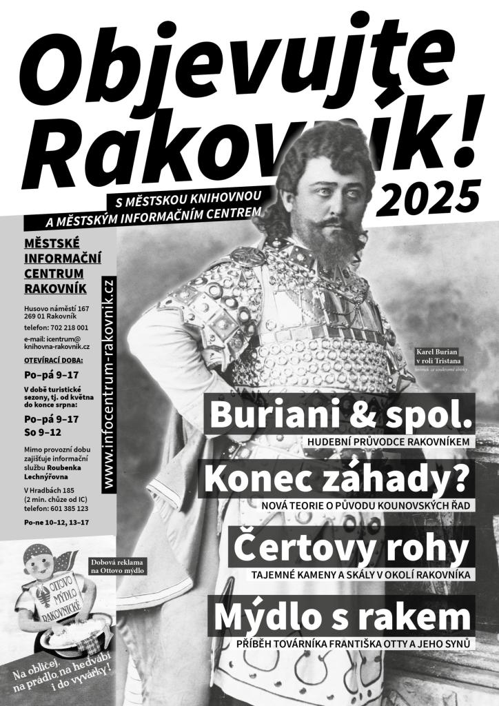 Letošní vydání turistických a vlastivědných novin "Objevujte Rakovník! 2025" je na světě. Na co se můžete těšit? Připravili jsme pro vás průvodce vycházkou za vynikajícími hudebními osobnostmi z minulosti Rakovníka, přiblížíme vám novou teorii o původu záhadných kounovských řad a čeká vás také příběh Františka Otty, zakladatele věhlasné rakovnické továrny na výrobu mýdla, která v letošním roce slaví 150. výročí svého založení. Turistické noviny jsou k dostání zdarma v Městském informačním centru Rakovník nebo v elektronické verzi prostřednictvím připojeného odkazu.